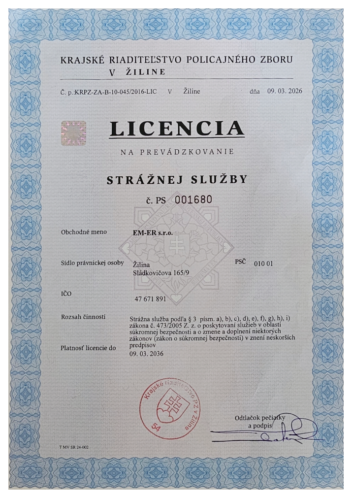 EM-ER s.r.o. zabezpečuje komplexnú strážnu službu podľa zákona č. 473/2005 Z. z. s pôsobnosťou po celom Slovensku. Naši profesionálni strážnici, vyškolení bývalými príslušníkmi policajných zložiek, poskytujú spoľahlivú ochranu majetku, objektov a osôb v akomkoľvek prostredí – verejnom, neverejnom aj vysoko rizikovom.